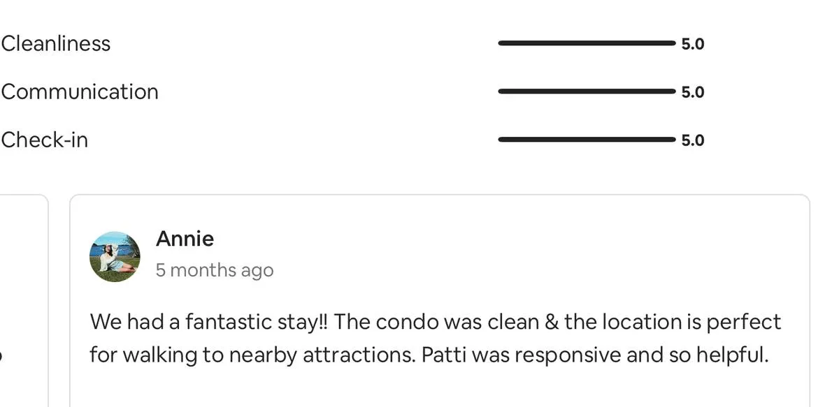 June-12 2024The Crab Shack was the perfect place for my solo birthday get away! The place is just as described in the pictures. The resort had a convenient store located downstairs, ice vending, a bar with food and drink, and an awesome pool and hot tub area! The private beach is just steps away and was never too crowded. Patti was one of the best most responsive AirBnB hosts I have ever had. She was super friendly, gave great instructions, and had quick excellent communication the entire time. She was even nice enough to accomodate me checking in early last minute! I would absolutely stay here again!