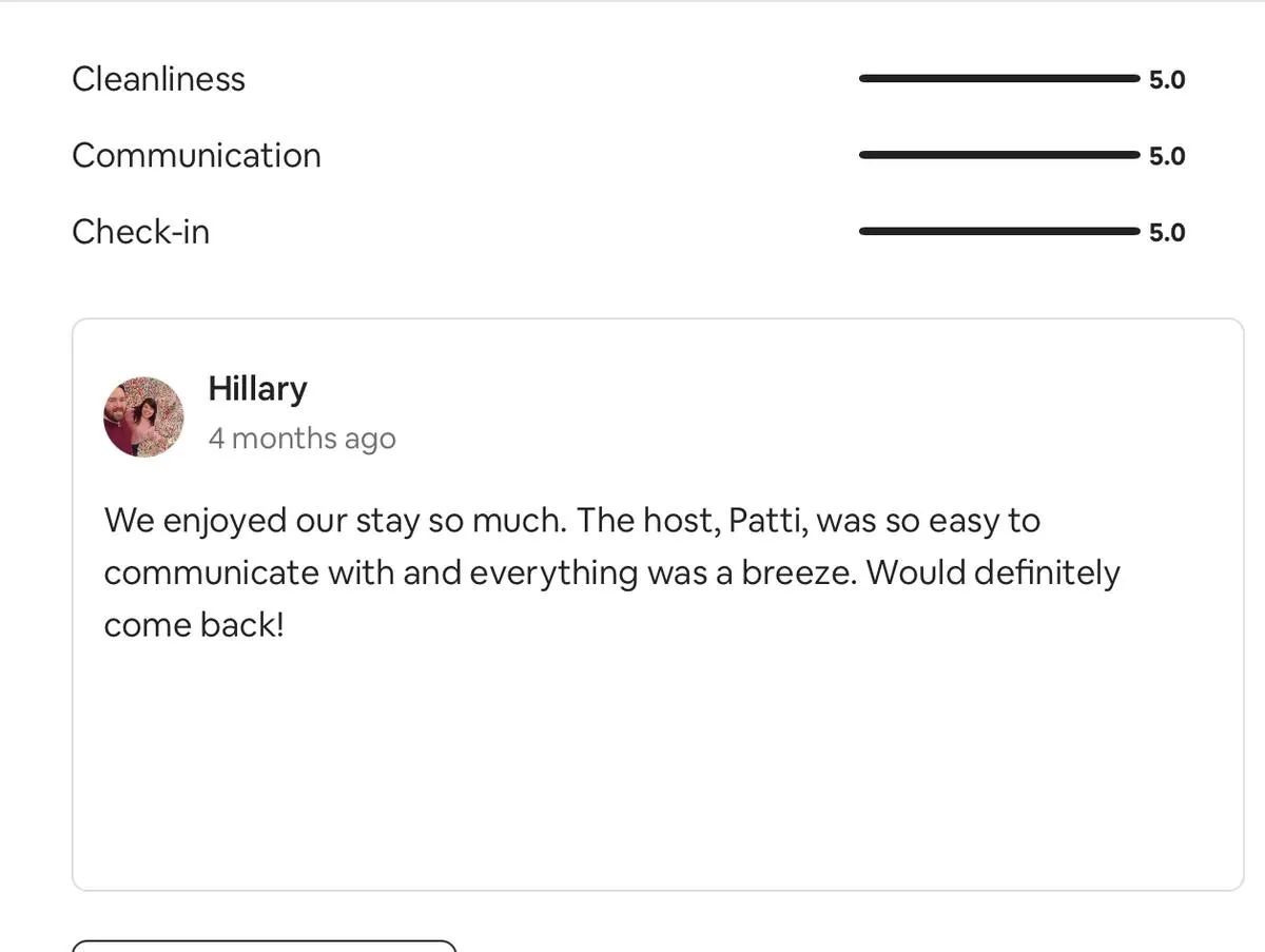March-12 2025Great place! Defintely would recommend and come back. Patti was great and responsive. Gorgeous view. Really clean and comfortable space!